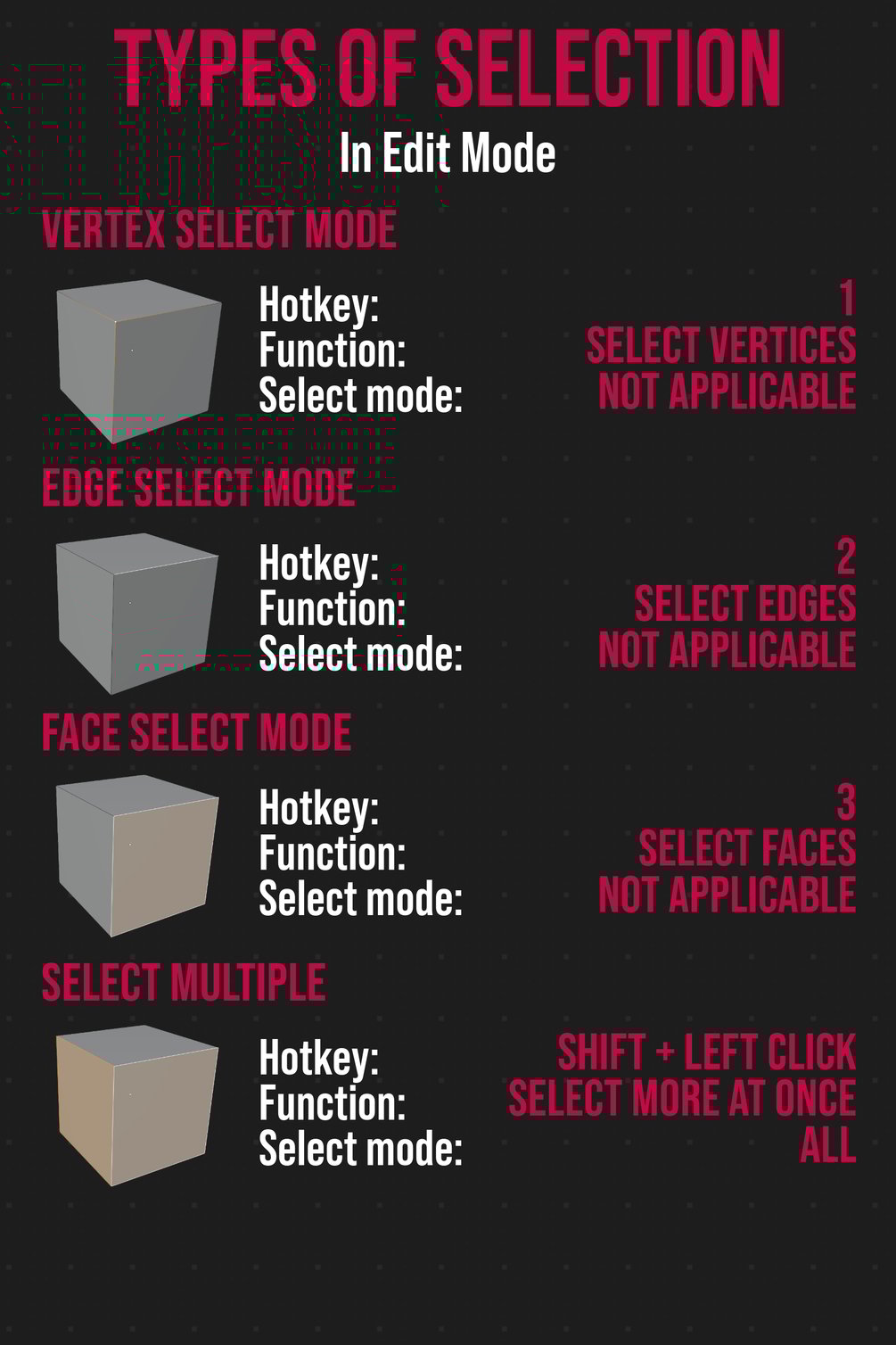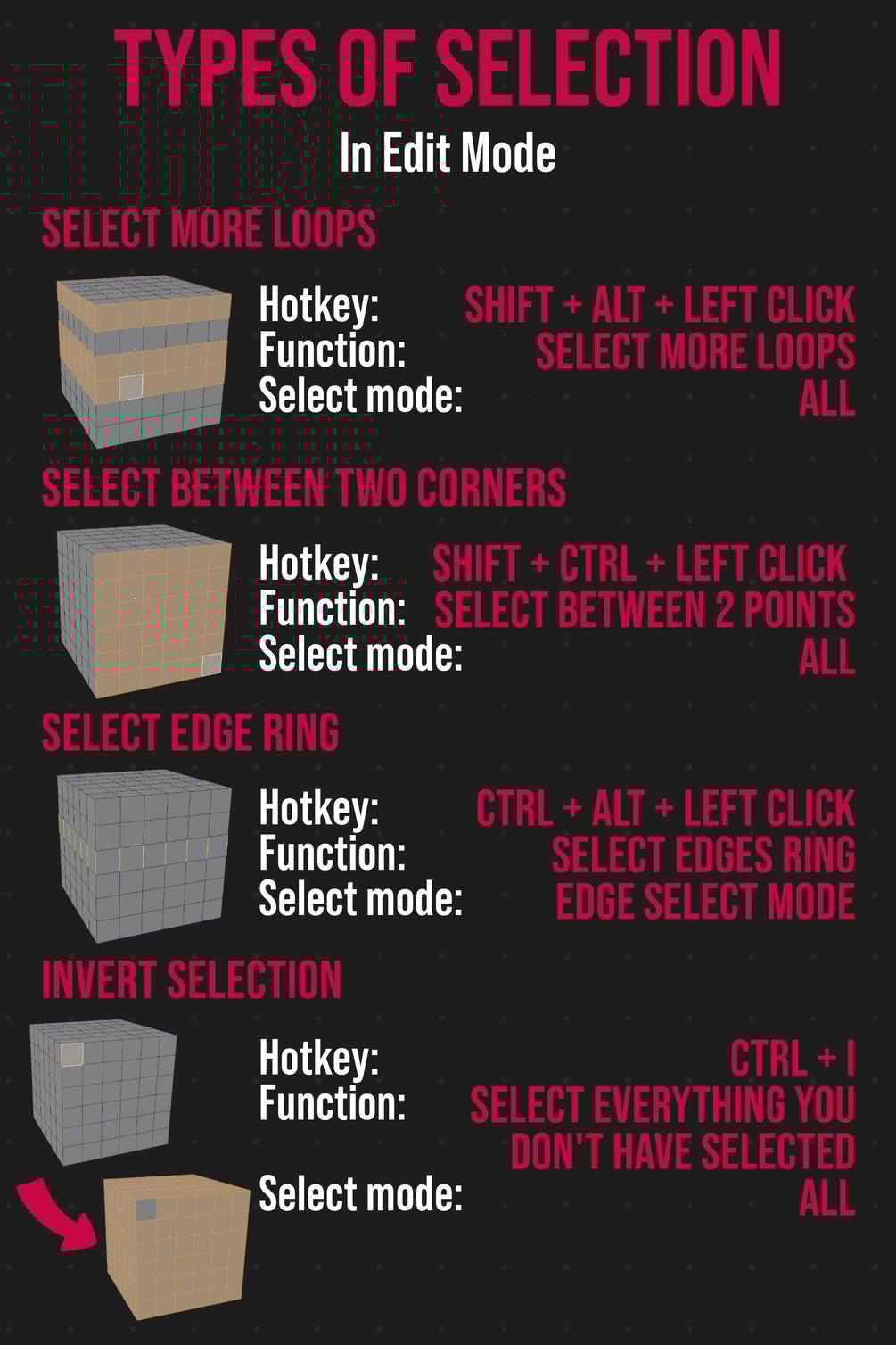 A free PDF guide which is the counterpart to this video I made on edit mode selection in blender: https://youtu.be/jvRP-aUFSHg